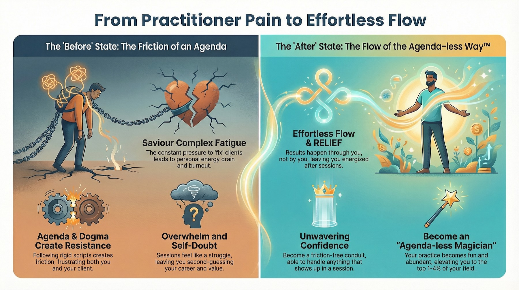 Discover why your own "efforting" is the secret handbrake on your clients' progress—and how The Agenda-less Way™ replaces the heavy burden of "fixing" with the profound relief of frictionless flow.